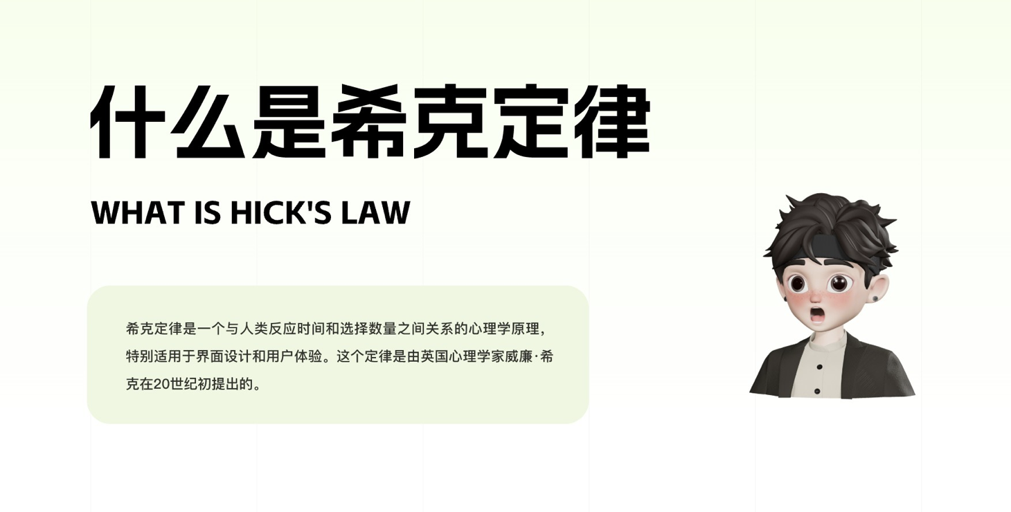 希克定律是由英國心理學家威廉?希克提出的認知心理學原理,核心揭示了用戶做出選擇的時間與可選項的數量成正比—— 面對的選項越多,用戶的決策時間越長,認知負荷也會隨之增加,甚至會產生選擇焦慮。這一原理在 UI 設計中尤為重要,因為界面的每一個選項、每一次決策,都直接影響著用戶的操作效率。
