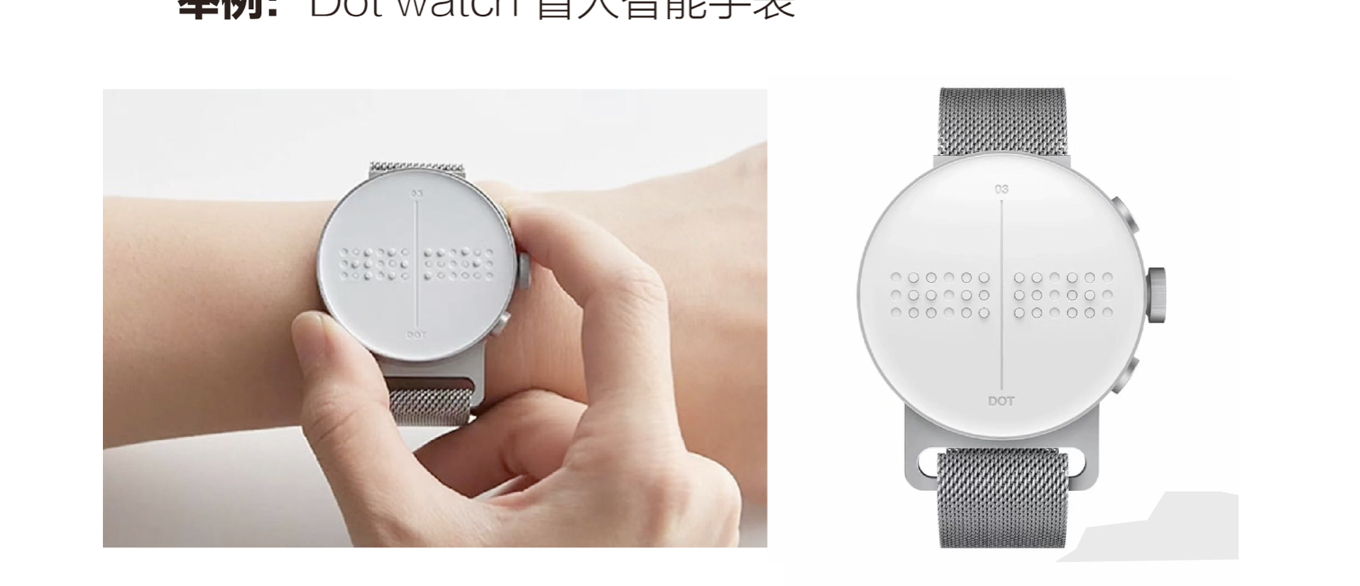 韓國 Dot Incorporation 公司研發的 Dot watch 盲人智能手表,則讓盲文與現代科技完美融合。表盤的 24 個盲點可通過上下浮動形成盲文凸點,不僅能清晰 “訴說” 時間,還能將短信、社交信息、來電姓名與號碼實時轉化為盲文,讓視障人群無需等待即可獲取信息;同時,手表支持私密瀏覽備忘錄,真正打破了視障人群的信息接收壁壘,讓科技為盲文賦能,讓設計服務于生活。