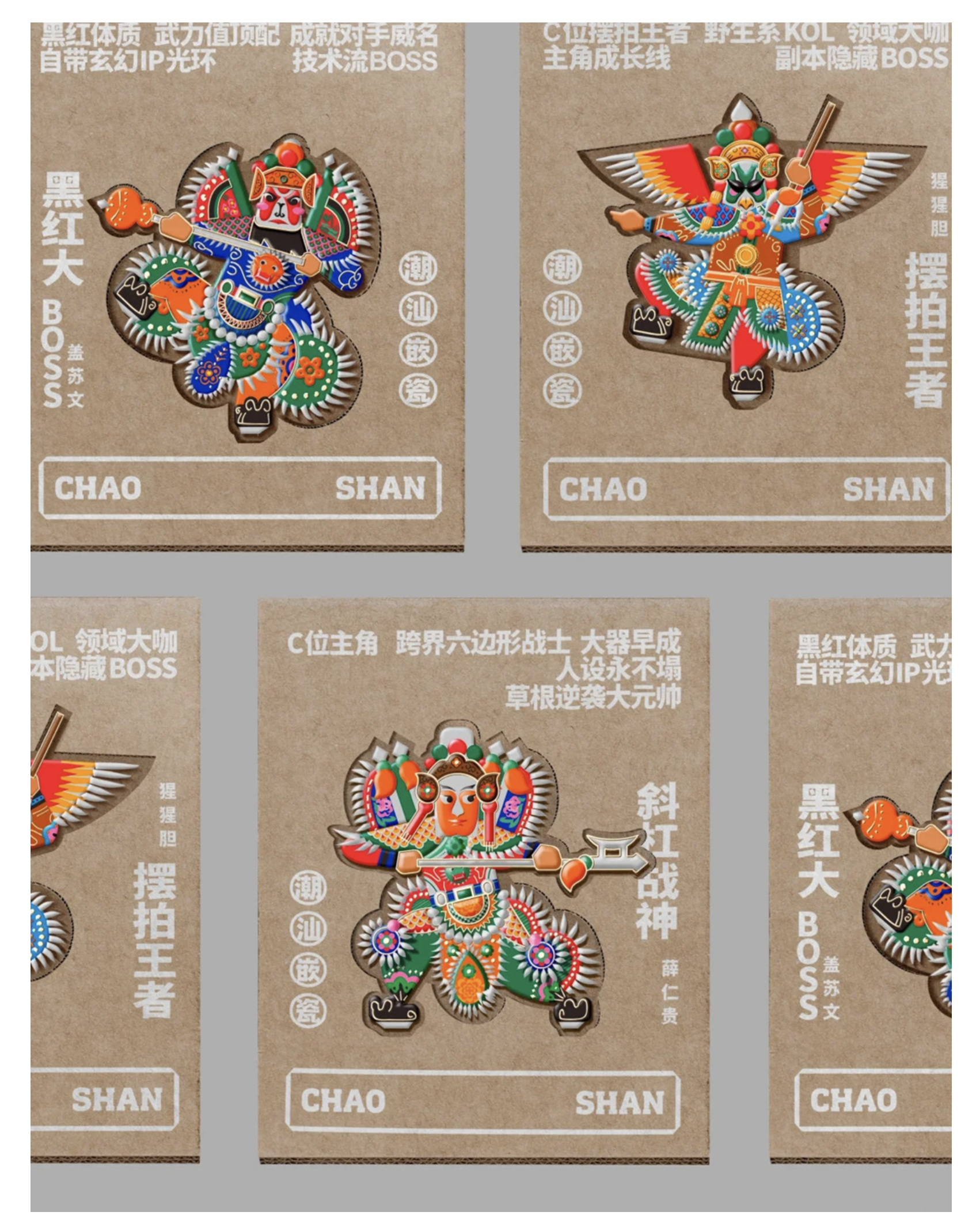 在視覺表達上,他采用極具沖擊力的視覺形式,將潮汕文化符號與潮流設計手法結合。黑紅為主的經典配色,既契合潮汕文化中喜慶、莊重的氛圍,又符合當代潮流的審美偏好;粗糲有力的字體設計,搭配 “CHAO SHAN” 的英文字樣,讓地域文化與國際潮流接軌;將嵌瓷的凹凸質感、木雕的紋樣細節轉化為平面視覺符號,讓非遺技藝的美感在海報、文創產品中被直觀感知。同時,他將傳統人物的人設標簽與視覺形象結合,讓薛仁貴、蓋蘇文的形象兼具傳統韻味與潮流個性,成為極具識別度的文化 IP。