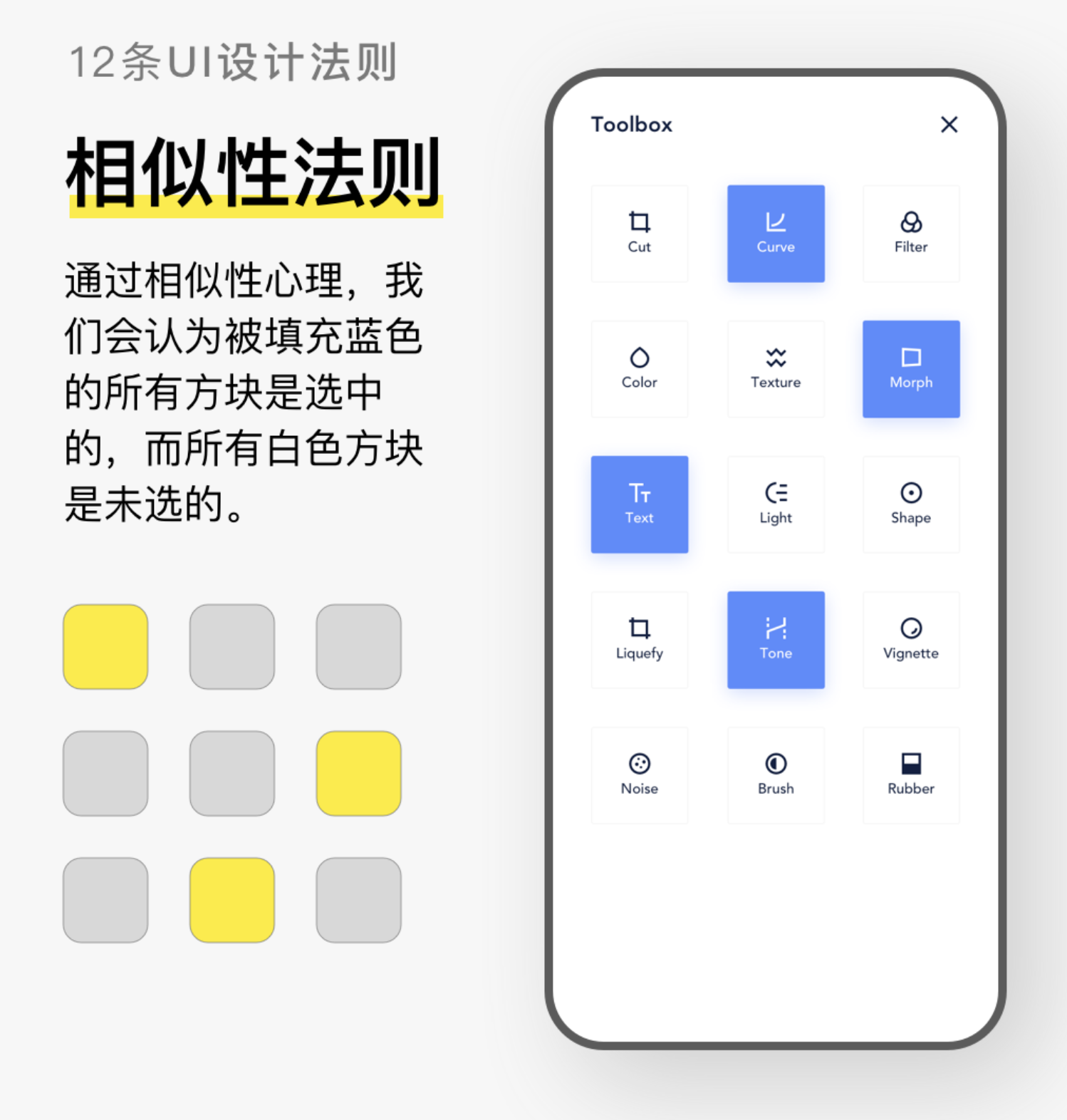 視覺特征相似(形狀、大小、顏色、質感)的元素歸為一類,主觀判定其具備相同功能或屬性。這一法則是保證界面一致性的核心基礎。