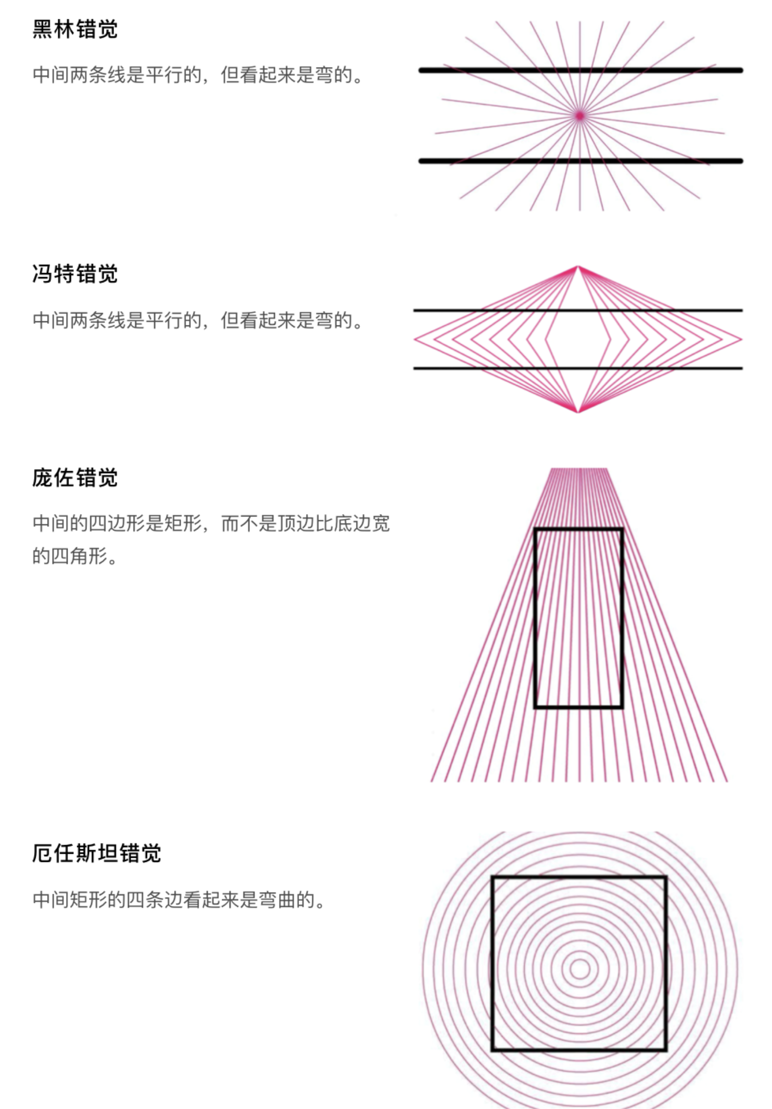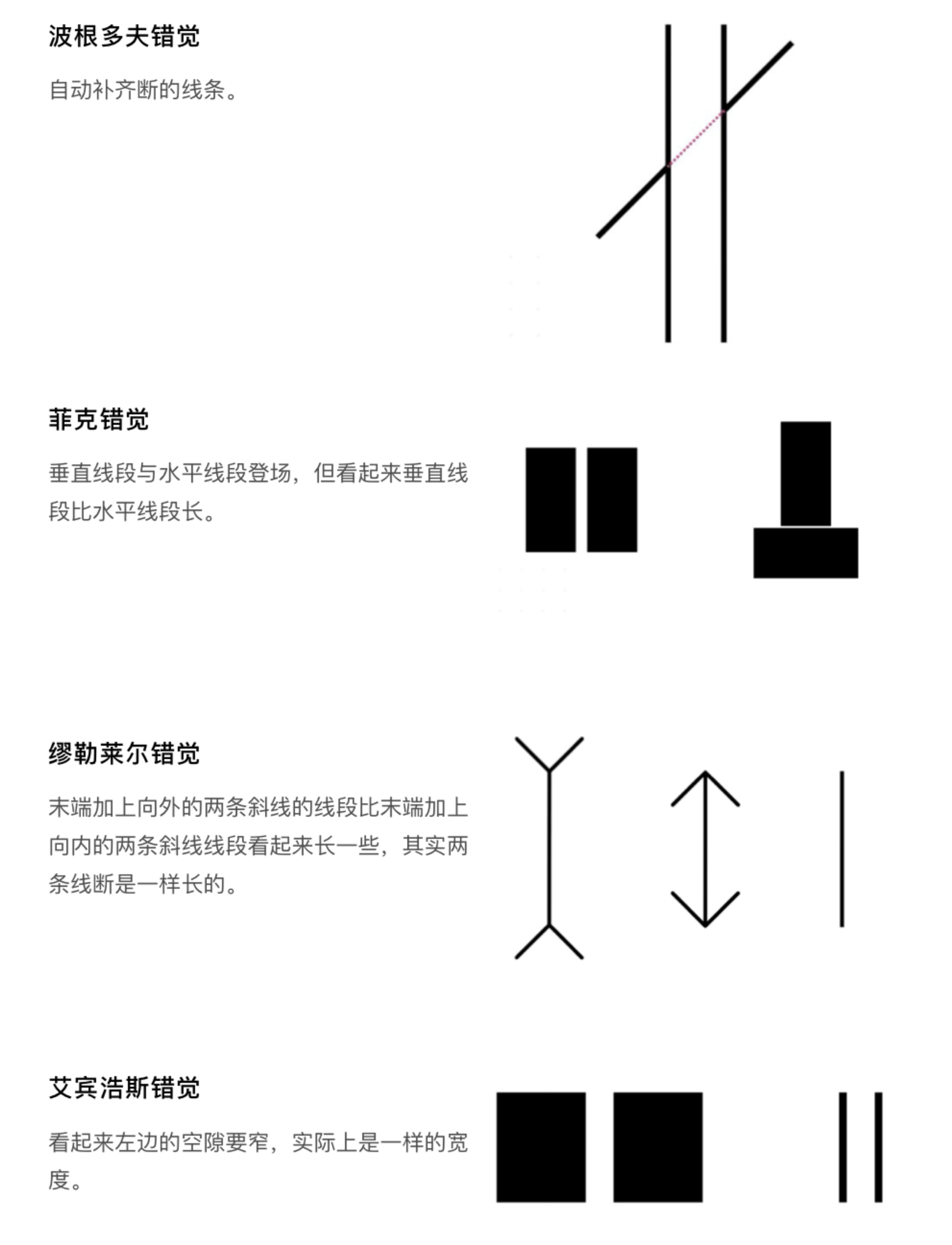 - 幾何感知錯覺:黑林錯覺、馮特錯覺中平行線條看似彎曲,龐佐錯覺中矩形看似頂寬底窄,厄任斯坦錯覺中矩形邊框看似彎曲,這些錯覺提醒我們,在設計直線型界面元素(如邊框、分割線、按鈕)時,需通過適度的視覺調(diào)整抵消錯覺影響,保證界面規(guī)整性;菲克錯覺、垂直水平錯覺中,等長的垂直線段比水平線段視覺上更長,繆勒萊爾錯覺中末端斜線朝向影響線段長度感知,這一規(guī)律常被用于按鈕、輸入框的尺寸設計,讓界面元素在視覺上達到平衡。