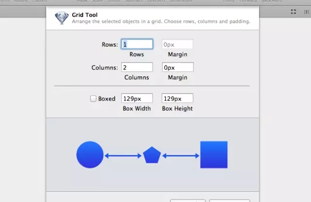 Sketch 有一個稱為 “Create grid” 的功能。點擊工具欄中的四個方格(如圖右上方的圖像),就會跳出一個菜單,在這里你可以設定你所需的行數和列數。