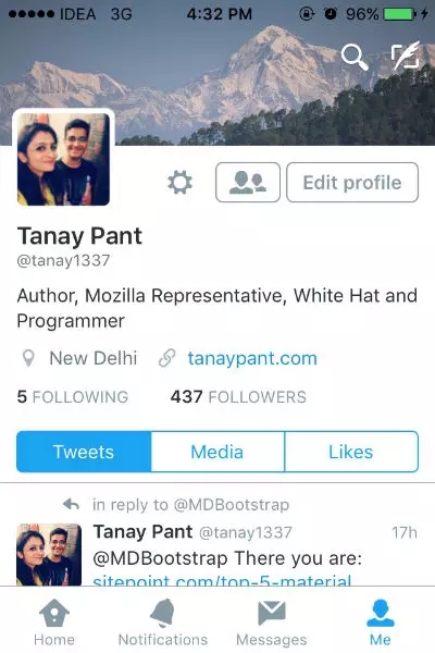 案例學習:Twitter上的切換鍵被放在屏幕的端。這幫助用戶更加快速的觸碰相關鍵如主頁(Home)、通知(Notifications)、消息(Messages)、我(Me)以進入軟件的各個部分。他們曾經將按鍵放在了最頂端,然而這增加了大屏用戶使用難度。