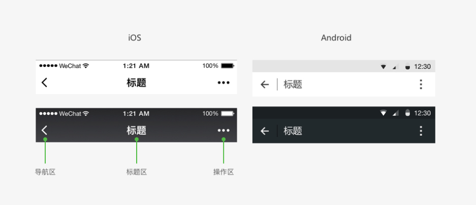 微信導航欄分為導航區(qū)域、標題區(qū)域以及操作區(qū)域。其中導航區(qū)控制程序頁面進程。目前導航欄分深淺兩種基本配色,在iOS和Android展示有所不同,如下圖所示: