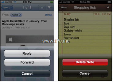 屏幕的底部一般是輔助性的工具欄或切換視圖使用的頁簽欄。一些影響較大的操作如果出現(xiàn)在屏幕下半?yún)^(qū)域,必須仔細(xì)考慮它們的排列設(shè)計(jì)。如圖5.1,一 般情況下,操作面板的取消按鈕放在最后,這樣可以鼓勵(lì)用戶閱讀完所有的選項(xiàng),暗藍(lán)色的返回按鈕可以和一般的按鈕區(qū)分開來,即便用戶沒閱讀完也知道這是返回 按鈕。對(duì)于一些影響較大的操作(如刪除),將其放在面板的頂部是最好的,因?yàn)轫敳扛菀妆豢吹剑偌由霞t色的警告暗示,用戶選擇起來會(huì)更為慎重。