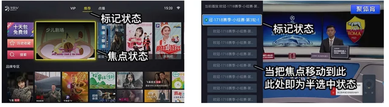 可能需要簡單講述一下“標記狀態”和“半選中狀態”:“標記狀態”在PC和手機端也非常常見,比如告知用戶所在位置在哪里的Tab標記;而“半選中狀態”是“焦點狀態”的一種情況,即移動到某個焦點后,不進行加載或觸發操作,需按“OK鍵”才觸發,如圖15所示。這種狀態在早期電視盒子性能不足、在Tab切換時經常需要使用,因為如果直接切換焦點時就加載,可能會造成卡頓。