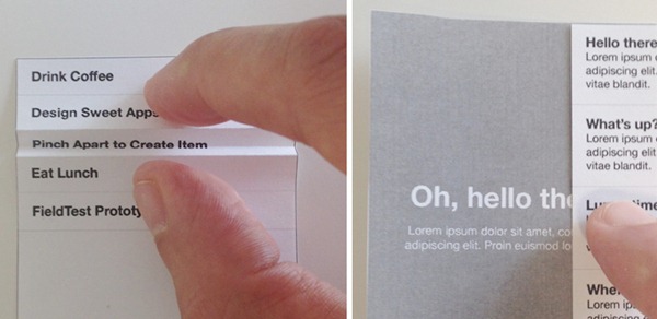 左邊的界面中,通過紙張的折疊來模仿 Clear 界面的拉伸添加條目,右邊的界面,則是模仿 Path 中滑動(dòng)展現(xiàn)分層。在把完折紙的過程中,Juan Sanchez 發(fā)現(xiàn),可以將折疊使用在滑動(dòng)分層上,即將上一層的信息折疊下來,展示下一層的內(nèi)容,是一種很有創(chuàng)意的交互方式。
