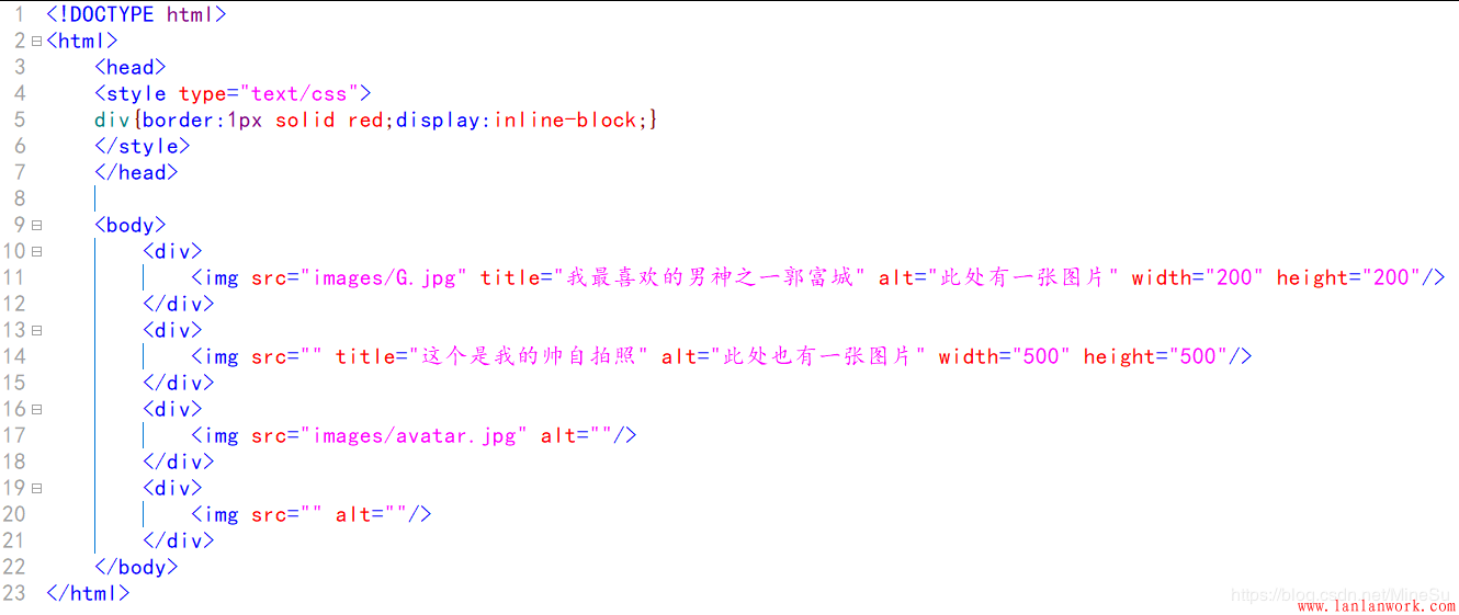 如果圖片路徑引用錯誤,都會導致網頁中的圖片無法正常顯示! 如,第 14 行和第 20 行代碼。