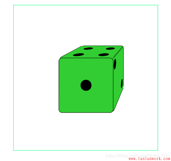 <!DOCTYPE html> <html lang="en"> <head> <meta charset="UTF-8"> <meta name="viewport" content="width=device-width, initial-scale=1.0"> <title>Document</title> <style> *{margin: 0;padding: 0;} ul{list-style: none;} a{text-decoration: none;} img{display: block;} .box1{width: 150px;height: 150px;display: flex;border: 1px black solid;margin: 20px auto;border-radius: 10px;justify-content: center;align-items: center;} .box1 div{width: 30px;height: 30px;border-radius:50%;background: black;} .box2{width: 150px;height: 150px;display: flex;border: 1px black solid;margin: 20px auto;border-radius: 10px;align-items: center;justify-content: space-between;} .box2 div{width: 30px;height: 30px;border-radius:50%;background: black;margin: 10px;} .box2 div:nth-of-type(1){align-self: flex-start;} .box2 div:nth-of-type(2){align-self: flex-end;} .box3{width: 150px;height: 150px;display: flex;border: 1px black solid;margin: 20px auto;border-radius: 10px;align-items: center;justify-content: space-between;} .box3 div{width: 30px;height: 30px;border-radius:50%;background: black;margin: 10px;} .box3 div:nth-of-type(1){align-self: flex-start;} .box3 div:nth-of-type(3){align-self: flex-end;} .box4{width: 150px;height: 150px;border: 1px black solid;margin: 20px auto;border-radius: 10px;display: flex;flex-direction: column;} .box4 div{height: 50%;display: flex;flex-direction: row;justify-content: space-around;align-items: center;} .box4 div li{display: block; width: 30px;height: 30px;border-radius:50%;background: black;} .box5{width: 150px;height: 150px;border: 1px black solid;margin: 20px auto;border-radius: 10px;display: flex;flex-direction: column;} .box5 div{height: 50%;display: flex;flex-direction: row;justify-content: space-around;align-items: center;} .box5 div li{display: block; width: 30px;height: 30px;border-radius:50%;background: black;} .box6{width: 150px;height: 150px;border: 1px black solid;margin: 20px auto;border-radius: 10px;display: flex;flex-direction: column;} .box6 div{height: 50%;display: flex;flex-direction: row;justify-content: space-around;align-items: center;} .box6 div li{display: block; width: 30px;height: 30px;border-radius:50%;background: black;} #box{width: 400px;height: 400px;margin: 20px auto;border: 1px springgreen solid; perspective: 500px;perspective-origin: right top;} #box .main{position: relative;width: 150px;height: 150px;margin: 125px; transform-style: preserve-3d;transition: 4s;transform-origin: center center -50px;} #box .main .box1{position: absolute;background:limegreen;left: 0;top: 0; width: 150px;height: 150px;} #box .main .box2{position: absolute;background:limegreen;left: 0;top: 0; width: 150px;height: 150px;left: 150px;transform-origin:left; transform:rotateY(90deg);} #box .main .box3{position: absolute;background:limegreen;left: 0;top: 0; width: 150px;height: 150px;left: -150px;transform-origin:right; transform:rotateY(-90deg);} #box .main .box4{position: absolute;background:limegreen;left: 0;top: 0; width: 150px;height: 150px;top: -150px;transform-origin:bottom; transform:rotateX(90deg);} #box .main .box5{position: absolute;background:limegreen;left: 0;top: 0; width: 150px;height: 150px;top: 150px;transform-origin:top; transform:rotateX(-90deg);} #box .main .box6{position: absolute;background:limegreen;left: 0;top: 0; width: 150px;height: 150px;transform:translateZ(-150px) rotateY(180deg);} #box:hover .main{transform:rotateY(360deg);} </style> </head> <body> <div id="box"> <div class="main"> <div class="box1"> <div></div> </div> <div class="box2"> <div></div> <div></div> </div> <div class="box3"> <div></div> <div></div> <div></div> </div> <div class="box4"> <div> <li></li> <li></li> </div> <div> <li></li> <li></li> </div> </div> <div class="box5"> <div> <li></li> <li></li> </div> <div> <li></li> </div> <div> <li></li> <li></li> </div> </div> <div class="box6"> <div> <li></li> <li></li> </div> <div> <li></li> <li></li> </div> <div> <li></li> <li></li> </div> </div> </div> </div> </body> </html>實(shí)際效果:![]()