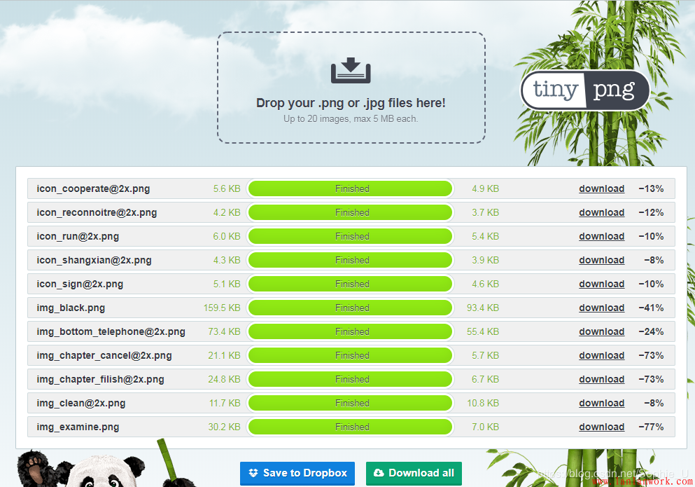 圖片小圖通過webpack可以直接轉為base64,而大圖可以通過壓縮或者換格式的方式來優化,這里推薦一個好用的圖片壓縮工具,工具:tinyPNG,如下是圖片轉換前后對比