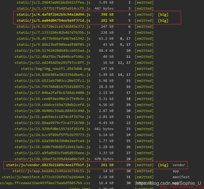 在完成了上述優化以后,下面著重關注下webpack打包后生成的文件大小,看還有沒有可以優化的余地。由于項目中已經通過路由按需加載的方式來做了功能拆分,所以通過webpack打包后生成了很多分散的js文件,如下圖:
