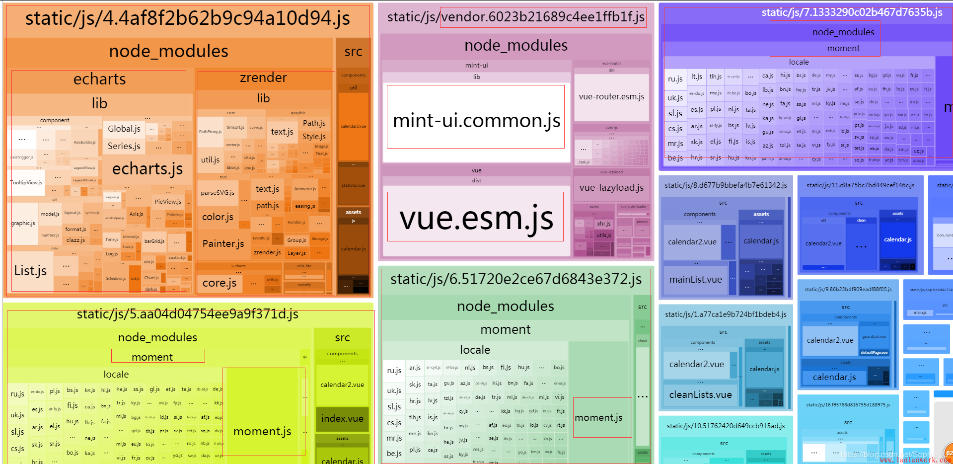 通過上圖分析可以知道打包后有幾個文件相對較大,vendor.js都知道是第三方庫文件打包形成,之前通過mint-ui按需加載會有一定的變化,后面記錄。這里著重看另兩個帶hash的js文件,這里并看不出來它為什么這么大,所以這里需要用到webpack打包分析工具來做進一步的打包文件分析:webpack-bundle-analyzer