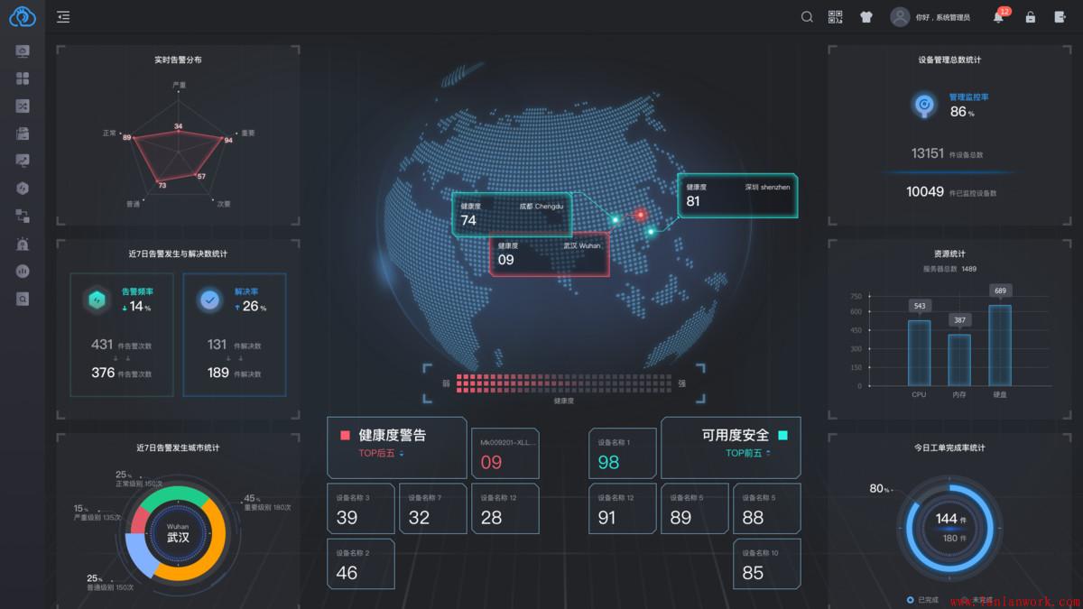 在集團企業中、以運維中心人員為用戶群體,通過大屏實時掌握業務數據情況,在系統設計時既要考慮數據的直觀性,又要考慮視覺疲勞,在其界面構思上要結合行業特點、數據特性進行策劃,以立體感形式表現更佳。