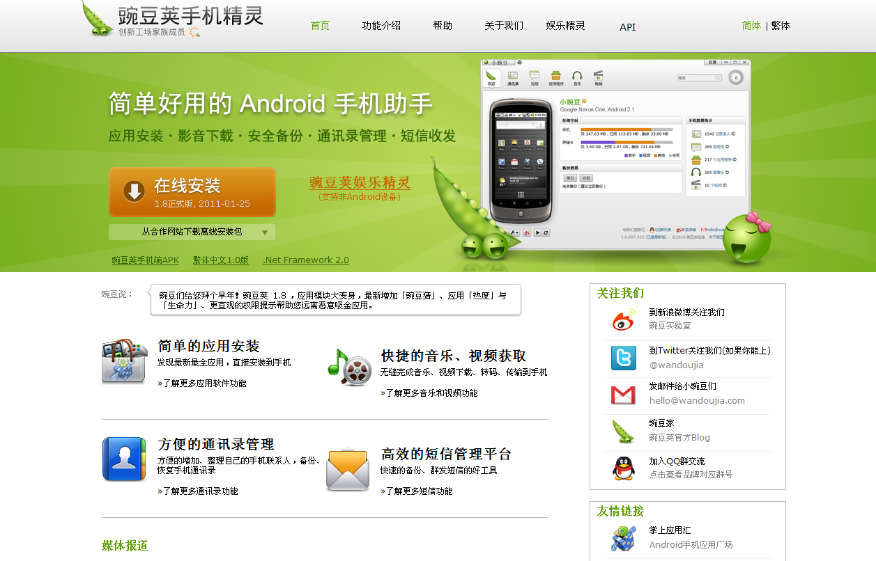 舊版和新版,適合了不同時期豌豆莢手機精靈推廣的需要。當拓展開市場之后,產品就要好的足以打動人,吸引不斷的去下載、使用,蘋果的網站也是如此。化繁為簡,至道無難。