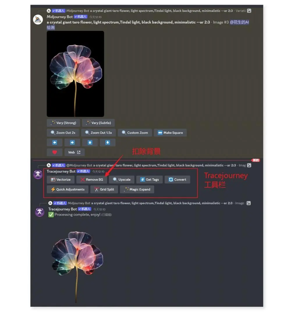 Tracejourney 是一款基于 Discord 的圖像處理工具,功能包括摳圖、圖像轉(zhuǎn) SVG、放大、提取描述詞、格式轉(zhuǎn)換以及亮度和對比度調(diào)節(jié),將圖片直接發(fā)送 Tracejourney bot,在彈出的工具欄內(nèi)點(diǎn)擊對應(yīng)的按鈕就可以了。