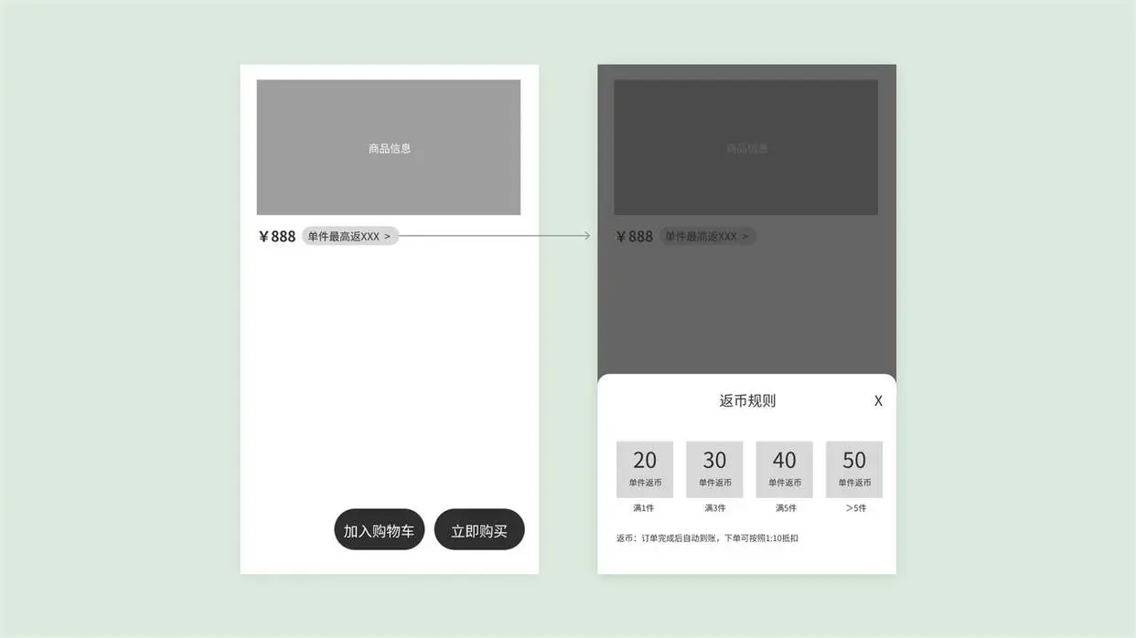 乍一看該功能都不需要設(shè)計(jì)師參與,只需要根據(jù)商品的返虛擬幣規(guī)則,將之前的單件反幣標(biāo)識(shí)改成多個(gè)就行,如“1 件返 XX、3 件返 XX…”,雖然看起來好像也解決了業(yè)務(wù)訴求,但是如果僅僅考慮標(biāo)識(shí)展示,而不結(jié)合需求背后的業(yè)務(wù)邏輯去思考,后續(xù)也會(huì)隨著規(guī)則的變化而帶來對應(yīng)的問題,那對于交互與UI設(shè)計(jì)師而言,針對這個(gè)需求,又該如何考慮的呢?我將分為“交互篇”與“UI篇”來分別闡述。
