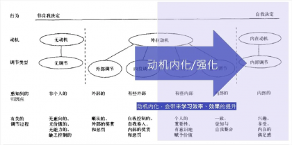 回歸到自我決定理論來看,大部分學(xué)生都處在非自我決定的階段,以無動(dòng)機(jī)或外在動(dòng)機(jī)的外部調(diào)節(jié)和內(nèi)投調(diào)節(jié)為主,他們對學(xué)習(xí)沒有動(dòng)機(jī),很難堅(jiān)持。從動(dòng)機(jī)側(cè)來看,我們要做的是把學(xué)生的動(dòng)機(jī)內(nèi)化/強(qiáng)化,去提升學(xué)習(xí)效率和學(xué)習(xí)效果的提升。