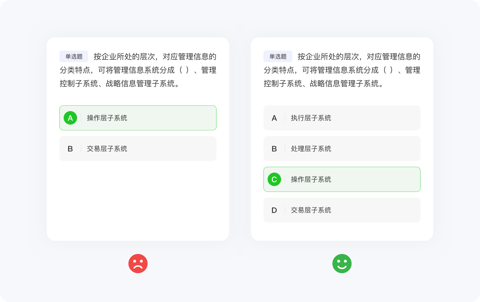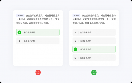 任何定律都有其自身的使用局限,所以也不要極度推崇希克定律而簡化到抽象的地步。大部分情況下,希克定律都是用在可交互界面中的元素,對于那些需要高度搜索、閱讀或學習刷題類的功能并不適用,因為設計師只能決定信息呈現的視覺效果,并不能決定內容的質量、類型與數量。例如,刷題類應用,面對海量的選擇題,希克定律雖然失去價值,但并不影響設計師結合其他方法論將界面設計的更好,總不能強行使用希克定律,將選擇題刪減到只剩兩個(變成判斷題)選項吧。