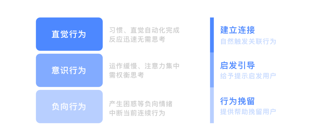 預判設計需要做的是根據用戶當前所處場景,判斷用戶需求及最終目標,分析用戶正在進行的操作,預判用戶下一步的行為,在整個行為路徑中為用戶適時提供相應的幫助或引導。根據用戶當前行為及目標的明確程度不同可將用戶行為分為「直覺行為」、「意識行為」、「負向行為」。