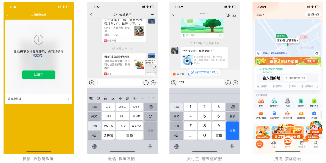 舉例:1)微信在用戶收款碼頁面中,用戶只要進行了截屏操作,一般都是想保存二維碼,所以微信在捕捉到用戶的截屏操作后,會自動觸發保存二維碼彈層;2)用戶剛進行截屏操作后,進入微信聊天頁點擊「+」,會自動浮現截圖,方便用戶直接發圖;3)支付寶聊天窗中,輸入了數字后會自動觸發轉賬的操作;4)滴滴中會記憶用戶過往目的地,并根據重復記憶結果,在用戶下次進入時,在目的地輸入框中浮窗展示目的地,簡化了目的地搜索過程,使重復行為變得更加簡單。