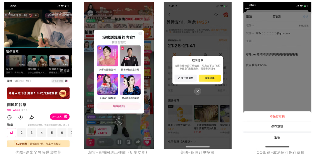 舉例:1)優酷視頻中,用戶在觀看視頻中,退出全屏時會判斷用戶對當前視頻興趣減弱,從而在小窗視頻下為用戶推薦其他視頻;2)淘寶中,用戶退出直播間時,系統會判斷用戶對當前直播不感興趣,為用戶提供其他直播內容推薦;3)美團取消訂單時,會為用戶提供修改訂單信息的功能,從而挽留用戶繼續當前訂單;4)QQ郵箱中,用戶在寫郵件時點擊取消時,會為用戶提供保存草稿的操作,方便用戶保存當前內容。