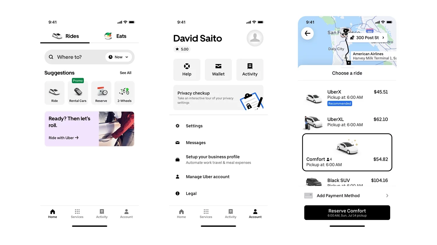 Uber 功能模塊與信息層級區(qū)分清晰,幾乎沒有營銷廣告信息干擾,減少了用戶無意義的操作。頁面功能聚焦,為用戶提供簡潔高效的叫車服務(wù),注重專業(yè)性,降低頁面思考時(shí)間。在成熟的海外市場,用戶對 App 的使用目的明確(如 Uber = 叫車),因此產(chǎn)品無需通過“附加功能”吸引用戶,而是通過優(yōu)化核心流程提升體驗(yàn)。