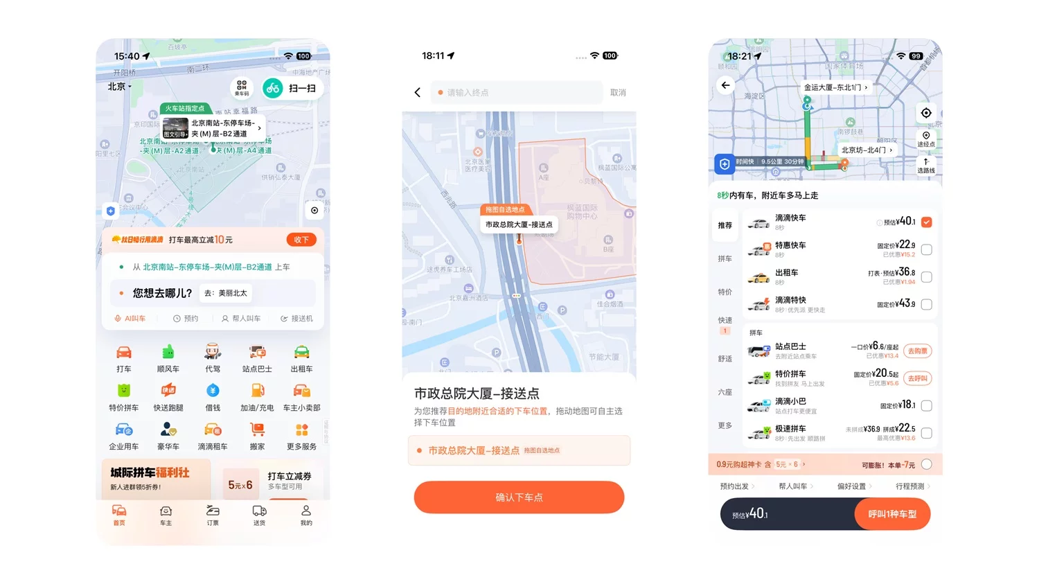 滴滴國內(nèi)版 則采用“高飽和度、多色彩分區(qū)”策略——橙色代表主叫車業(yè)務(wù)、綠色代表拼車、藍(lán)色代表巴士服務(wù),同時(shí)用不同顏色區(qū)分路況(如紅色擁堵、綠色暢通),通過強(qiáng)烈的色彩對比吸引用戶注意力,貼合國內(nèi)用戶對“熱鬧感”“明確區(qū)分”的視覺偏好。