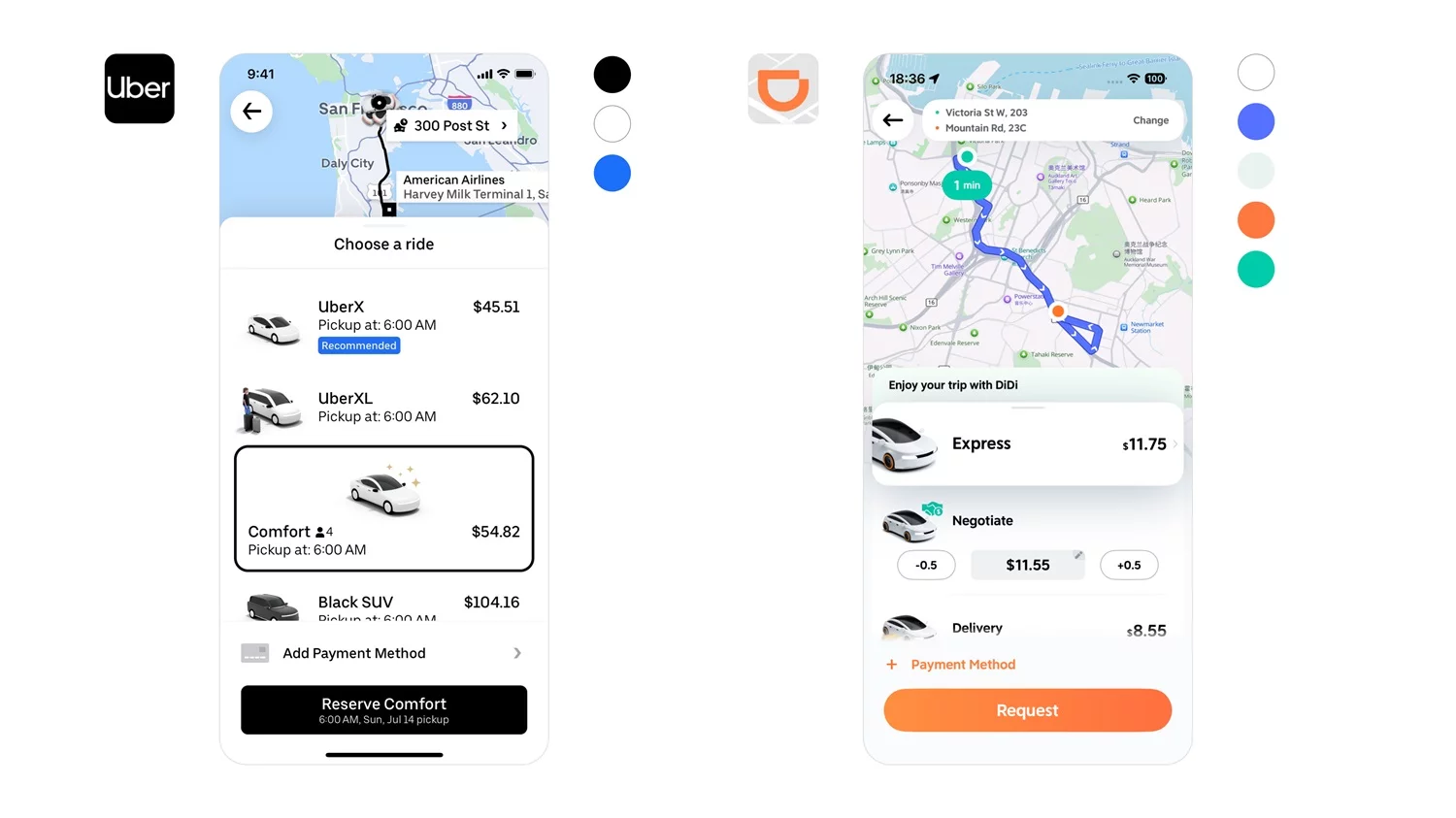 滴滴國際版 色彩使用略多于 Uber,但仍以“功能區(qū)分”為核心——地圖起終點(diǎn)用對比色標(biāo)識、特殊車型用專屬顏色標(biāo)注,避免多余裝飾色造成視覺疲勞。