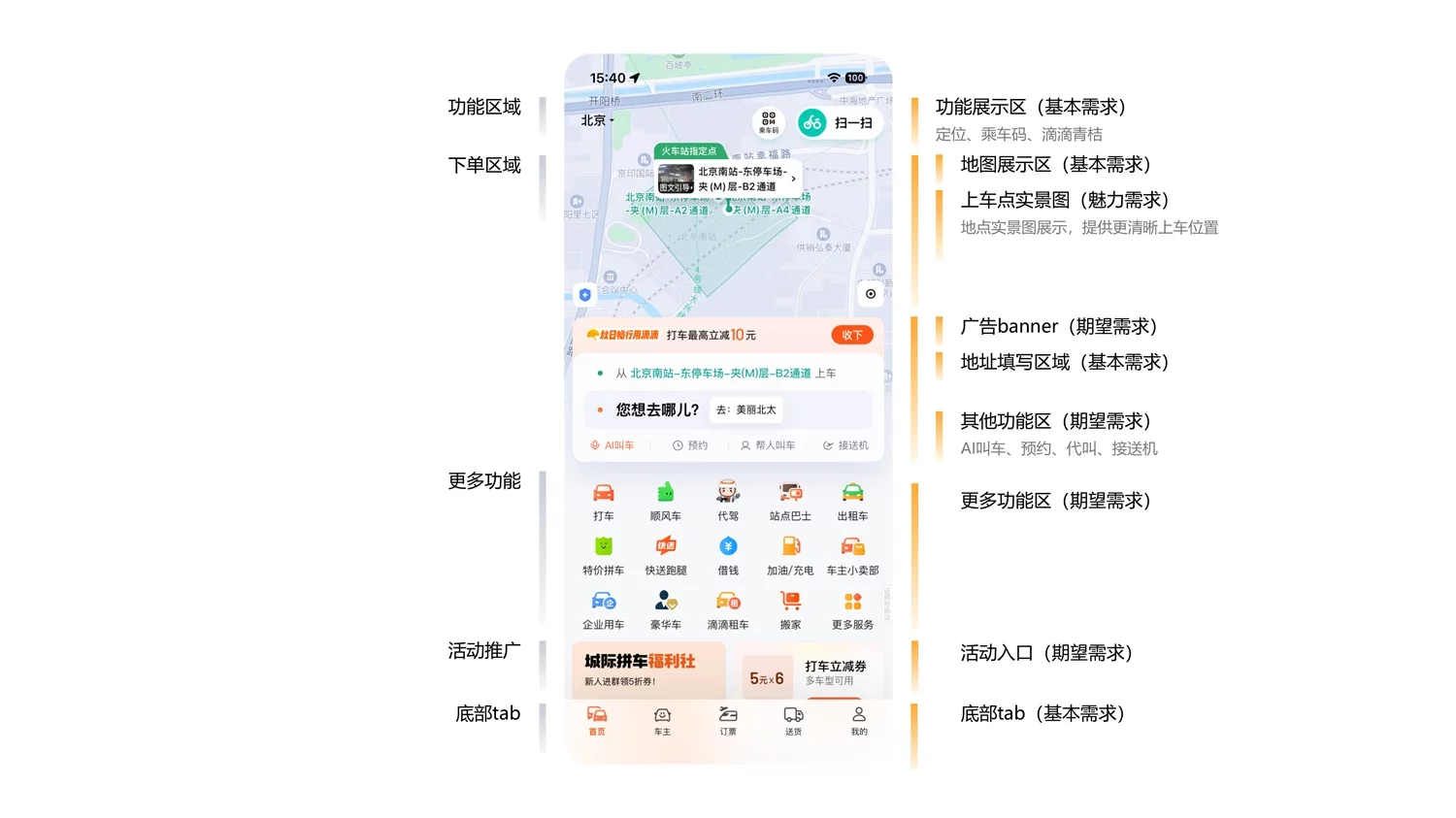 整體來看,兩款軟件的首頁布局大致可分為五個(gè)區(qū)域:功能區(qū)域、下單區(qū)域、更多功能、活動(dòng)推廣、底部 Tab。二者功能分類框架相似,但每個(gè)區(qū)域的“功能優(yōu)先級”與“信息承載度”差異顯著:
