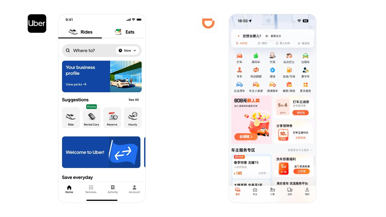 相比之下,滴滴國內(nèi)版的內(nèi)容排版信息密度明顯更高:在有限的屏幕空間內(nèi),不僅包含叫車功能,還疊加了活動(dòng)提示、附加服務(wù)入口等內(nèi)容,排版相對緊湊。