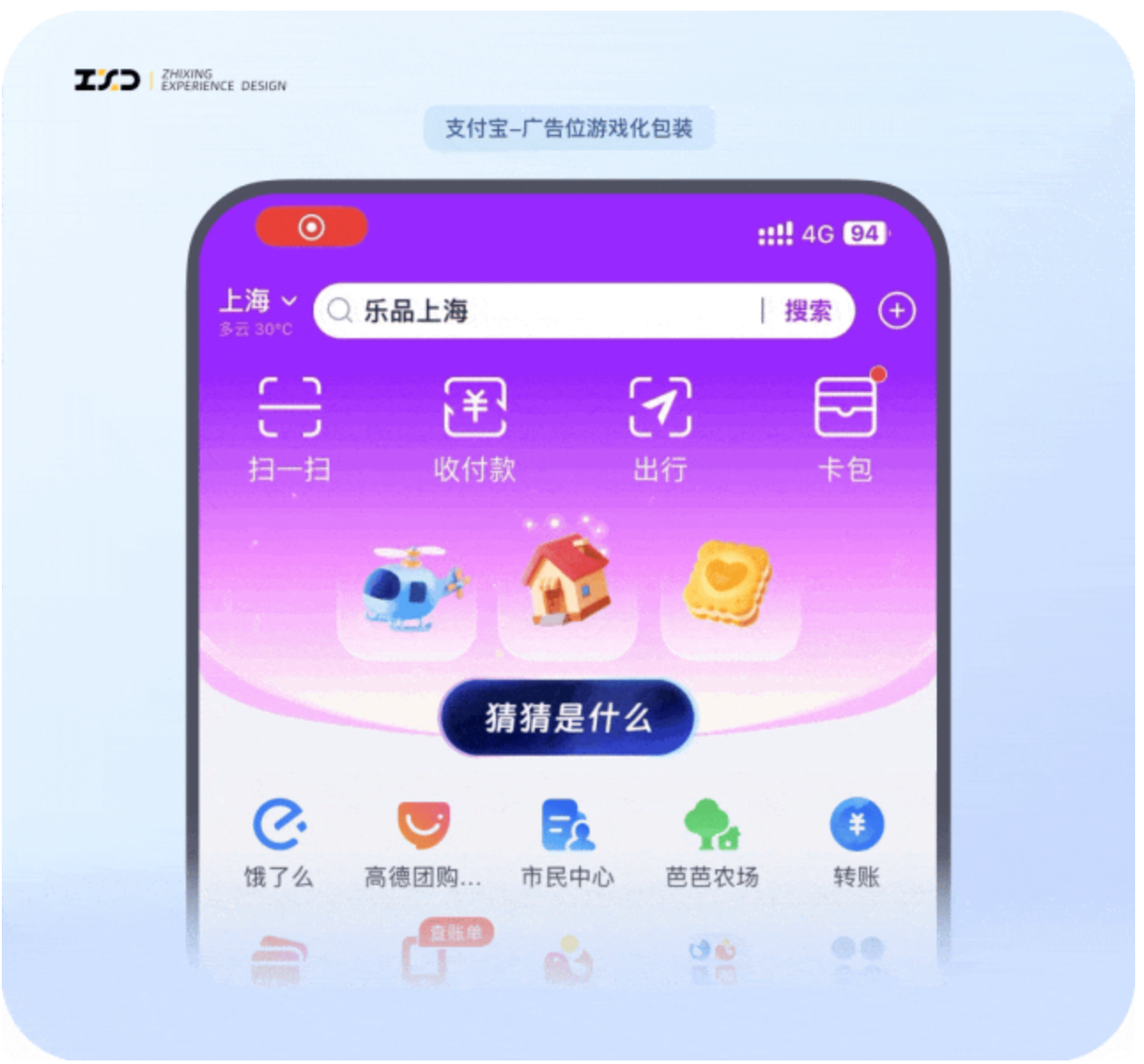 支付寶的首頁Banner通過游戲化的包裝,快速吸引注意力,驅動用戶主動點擊探索,高效地為活動頁面引流。