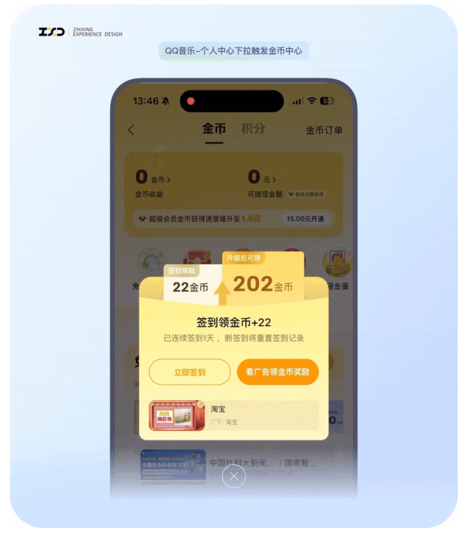 用 “金幣” 作為即時激勵,滿足用戶即時反饋的心理需求,驅動次日復訪,同時聯動積分體系,將單次簽到轉化為長期行為