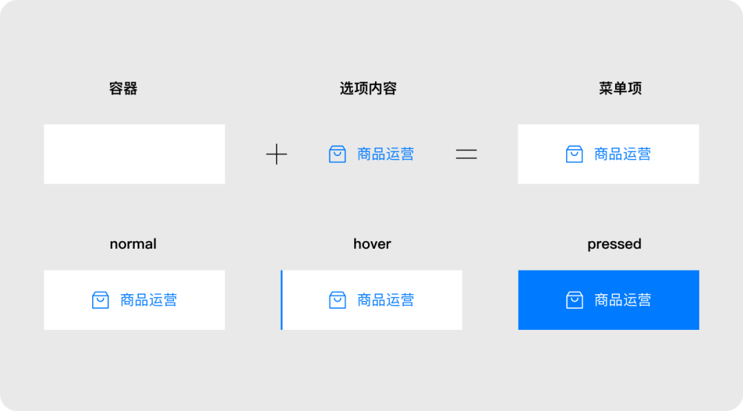 導航菜單是由多個菜單項集合組成的。菜單項由容器+選項內(nèi)容(圖標+文字或文字)組成,交互行為是點擊菜單熱區(qū)后跳轉(zhuǎn)到相應目標頁面。
