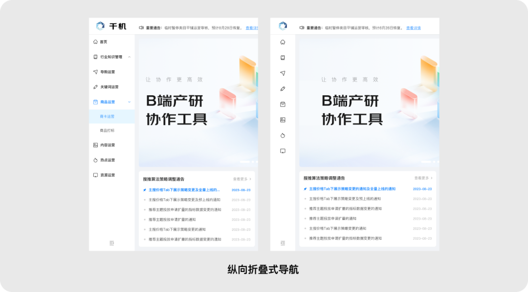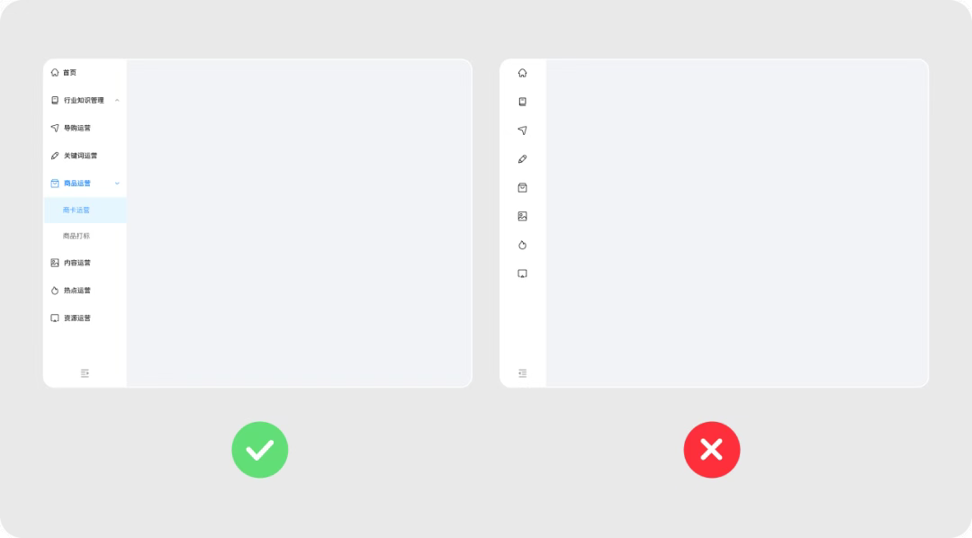 縱向?qū)Ш街糜陧撁孀髠?cè),垂直延展,選項優(yōu)先級由上而下遞減。用戶可以在不同選項中快速切換,操作效率較高;縱向空間可以容納更多菜單選項,并且可以延展二級分類。拓展性比較高,適合專注操作的后臺類產(chǎn)品。