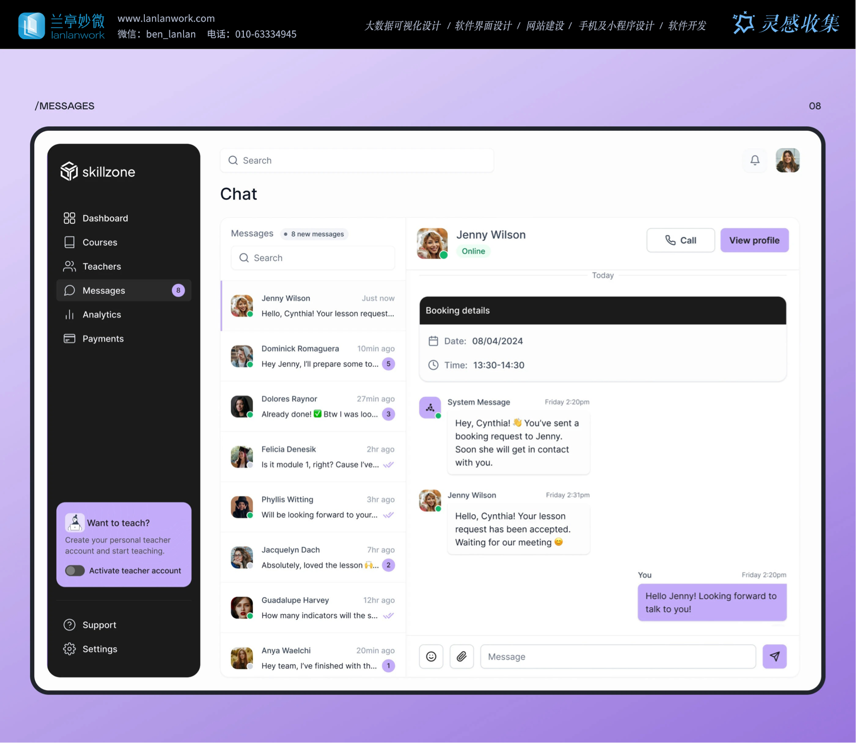 足多樣教學(xué)需求。消息模塊里,聊天界面實時顯示在線狀態(tài)、課程預(yù)約詳情,師生溝通方便又順暢。這些貼心設(shè)