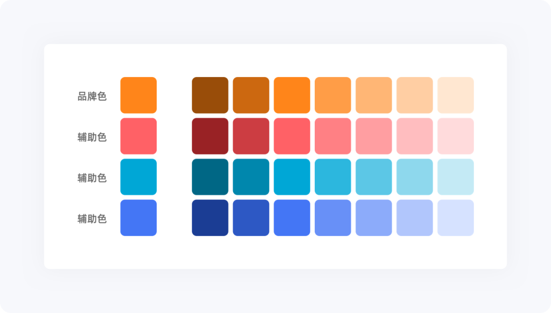 同色系為統(tǒng)一的色相,使用中可以加深品牌色的感知,可以讓界面更有層次,同時(shí)可以讓界面保持色彩上的一致性;由于業(yè)務(wù)的多樣化,我們需要多色搭配為輔;多色的輔助顏色,也可稱之為功能色,可設(shè)定不同的任務(wù)屬性和情感表達(dá);再搭配中性色黑白灰,賦予更多的變化和層次。