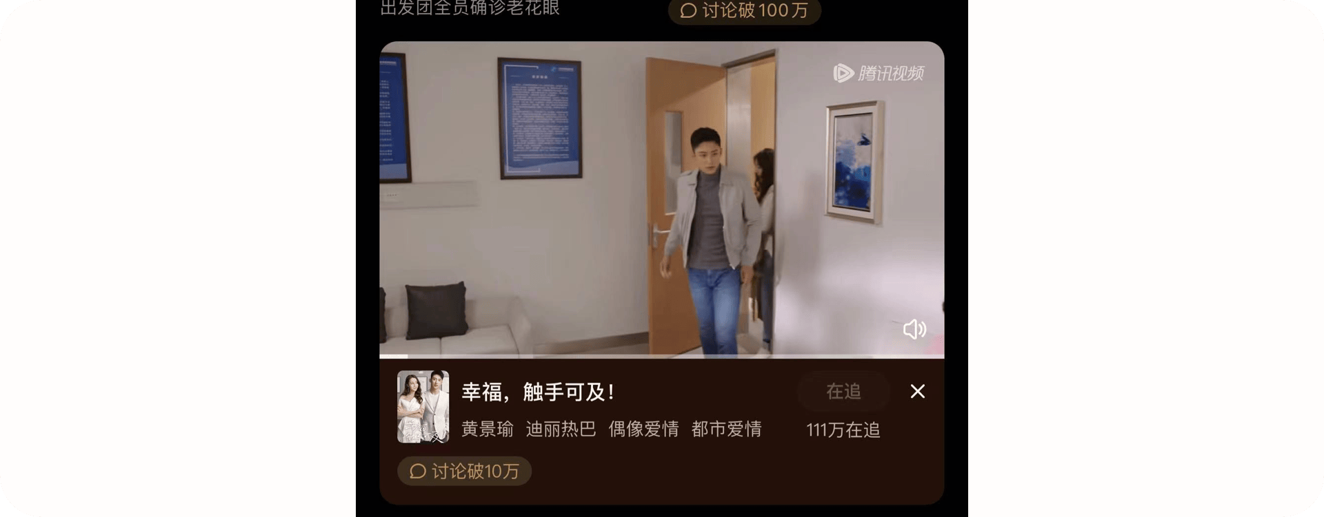 2.2.3產品亮點:視頻大卡片推薦這種樣式的推薦形式雖然同屏下相比雙瀑布流的可推薦內容少,但可以讓用戶更注重內容視頻本身,推薦的視頻內容都為該作品的熱門片段,小編經??粗粗桶怖艘粋€新劇,很適合作為長視頻推薦列表使用