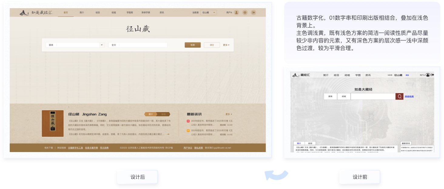 古書按列呈現,每一列都制成為長卡片,古體字和簡體字一一對應,內容和背景區分開且大量留白,列與列劃分明顯