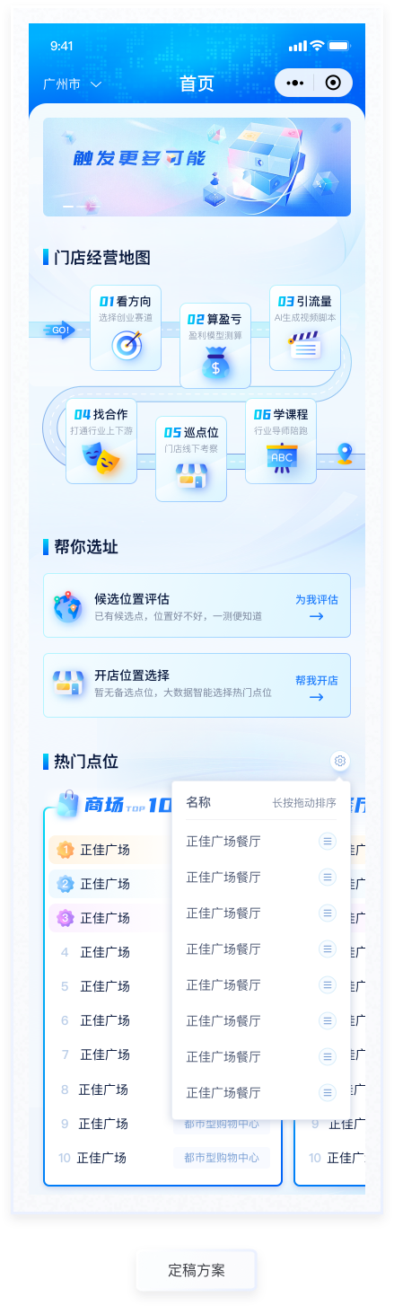 所盈利測算功能是產品的主要功能,通過AI對未來開店盈虧情況進行預測評估。本次設計主要優化該流程的交互及視覺表現,整個流程分為“成本結構”“收入結構”“經營測算”三個階段,過程填寫情況放置在頁面頂部,一步了然。已填寫使用主題色標注,未填寫則使用置灰顏色處理,符合用戶基本感知。按鈕使用與主色相近的漸變色。