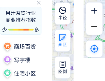 按鈕換膚在地圖上,“半徑”“選區”便于用戶對開店范圍的選擇,“圖例”則更側重圖標說明性。“放大”“縮小”“定位”則是對顯示內容的操作。