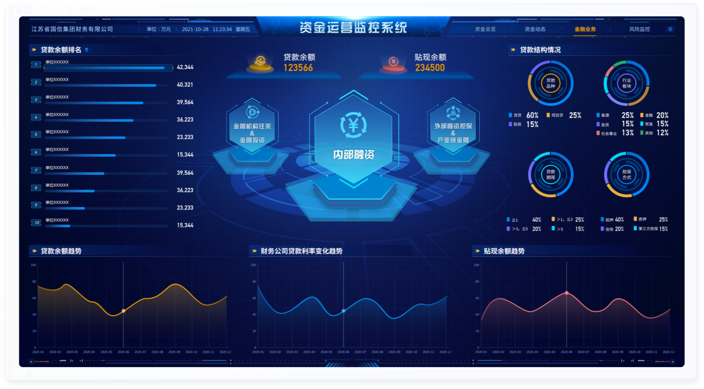 九恒星科技股份有限公司是一家企業資金管理軟件產品及企業金融信息增值服務的提供商,致力于通過信息技術的應用,幫助企業改善現金流;在金融機構與企業之間架起橋梁,讓企業的資金流更加順暢。大屏主要應用場景:公司會議、集團視察、行業參觀等。領導駕駛艙是系統重要的展示功能,主要應用場景:財務公司各級領導日常運營決策查詢、公司會議等,可作為系統特色功能,使用較為頻繁。